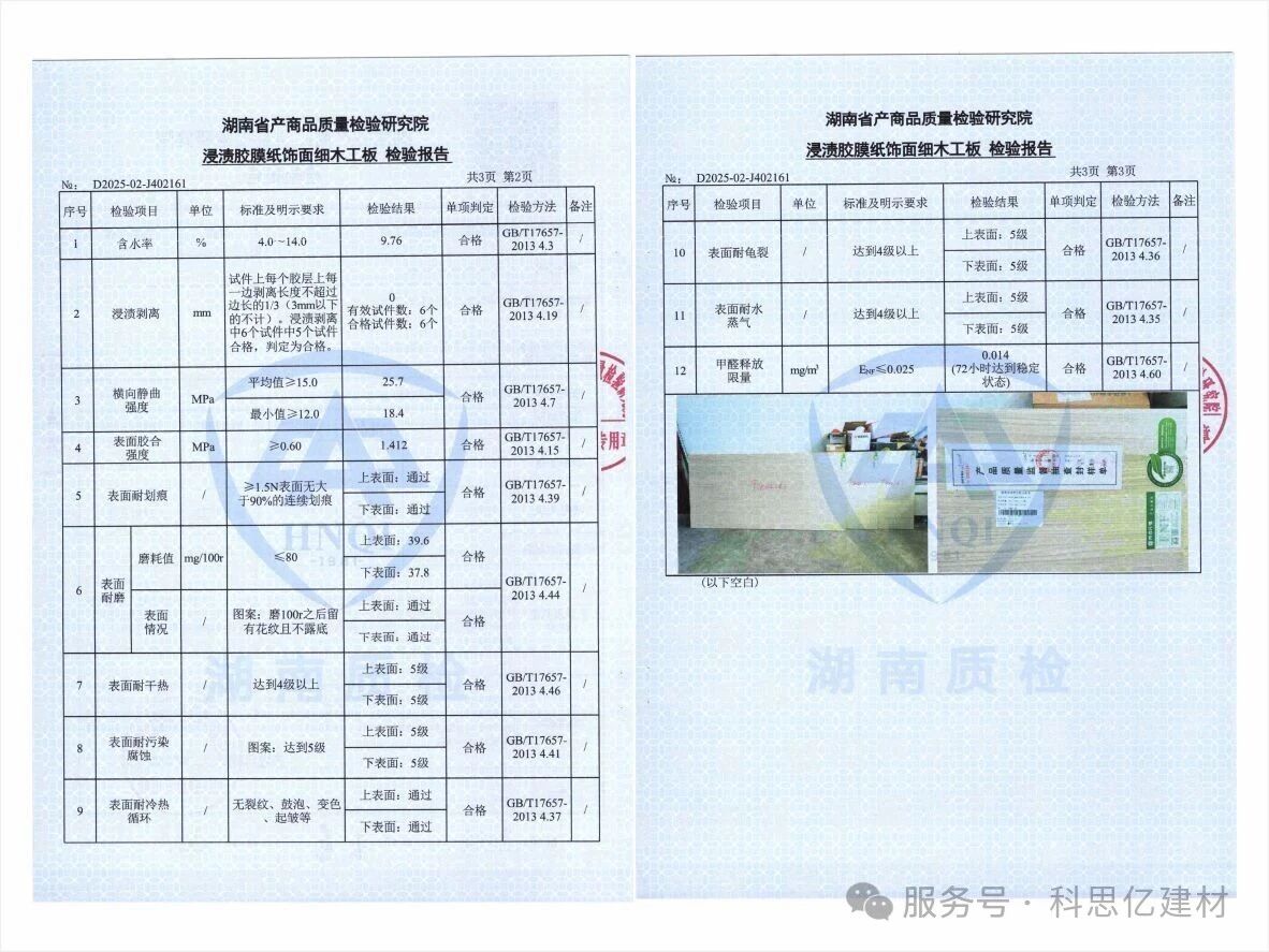 本次抽检对帝森元福浸渍胶膜纸饰面细木工板、浸渍胶膜纸饰面胶合板等多款产品进行了全面评估。检验项目涵盖了板材含水率、胶合强度、表面耐划痕及甲醛释放量等多项关键性能与环保指标。这些指标直接关系到板材的尺寸稳定性、结构牢固度、使用寿命及家居环境的健康安全。